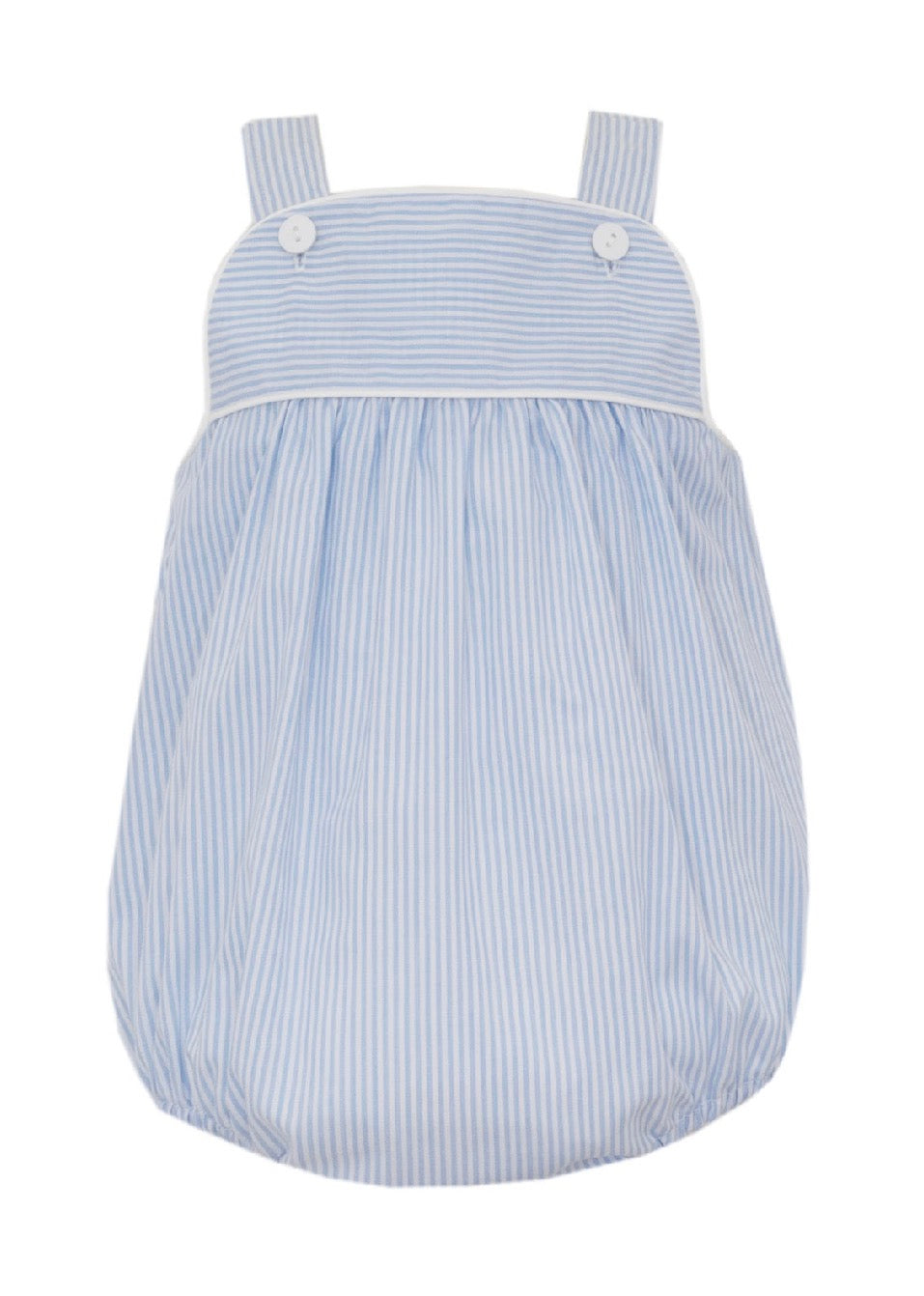 Keep your little one comfortable and stylish this season with our Blue Stripe Strap Bubble. Perfect for warm weather play, this charming piece features classic blue stripes and adjustable straps for a secure, custom fit as your baby grows.