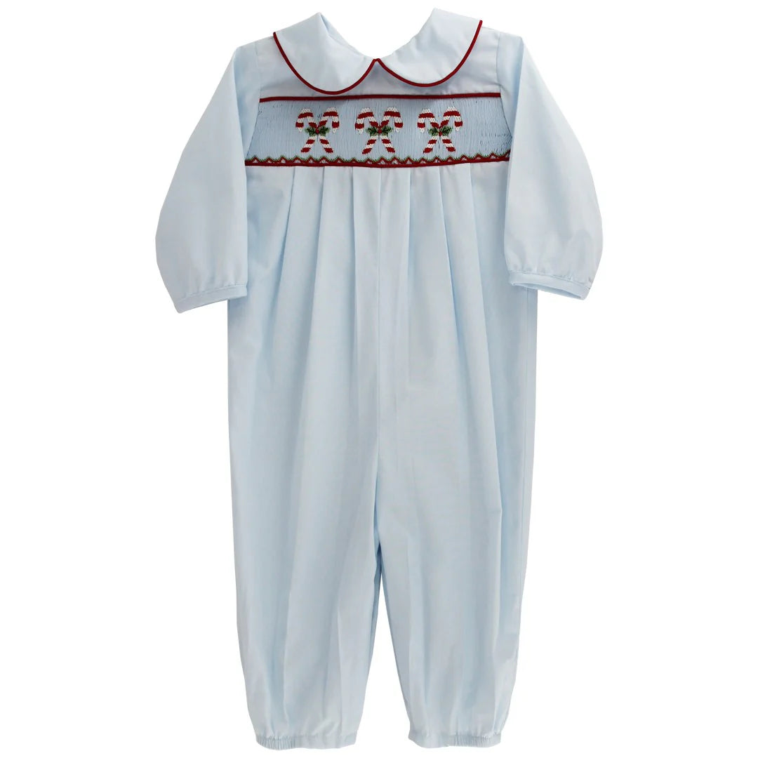 Get him ready for the festive season in this precious smocked long bubble. Perfect for your dapper little man, this timeless piece features a Peter Pan collar piped in red, long sleeves with just a touch of a cuff, elasticized hem, pleating, and a classic smocked chest with holly-adorned candy canes that make this heirloom-quality piece memorable.