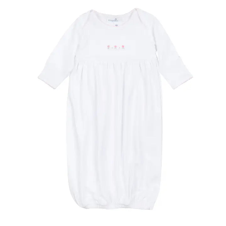This hand-embroidered lap-shoulder gown has the perfect blend of simplicity and delicate details. We love the pink picot trim, the trio of hand-embroidered roses across the chest, and the way the gown is sweetly gathered.