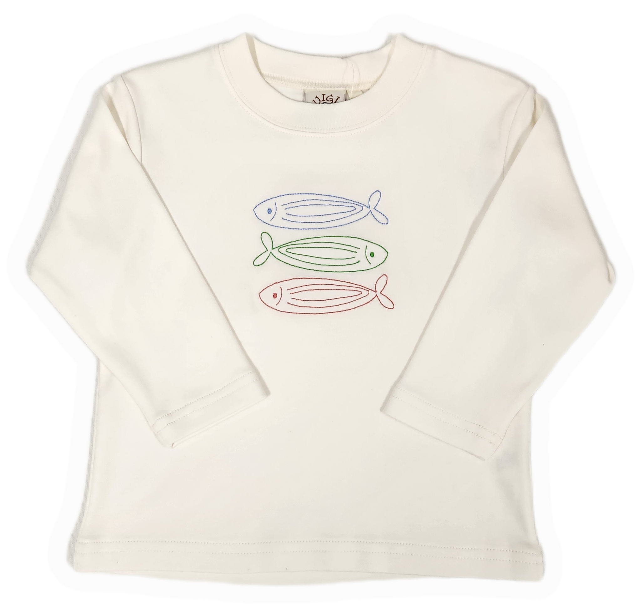 Creamy ivory colored shirt with a trio of red, blue, and green embroidered fish stacked on the chest.