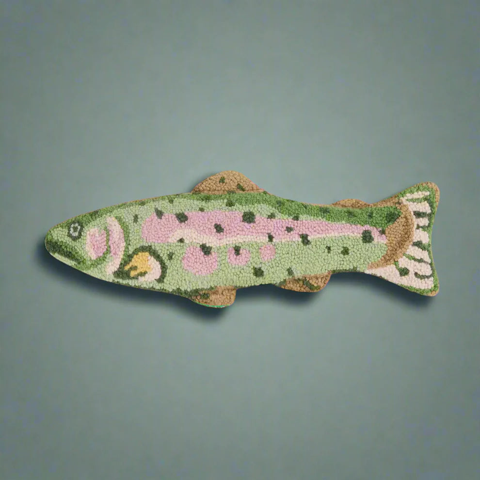 Reel in the compliments with our Shaped Trout Cushion! This isn’t just a pillow—it’s a conversation starter. Handcrafted with 100% wool on the front, it features a green, pink, tan, trout that’s hooked in a delightful design. The back? Luxurious velvet, because your sofa and bed deserve a touch of glamour. Perfect for adding a whimsical flair to any room. Whether you're a fishing fan or just love a pop of color