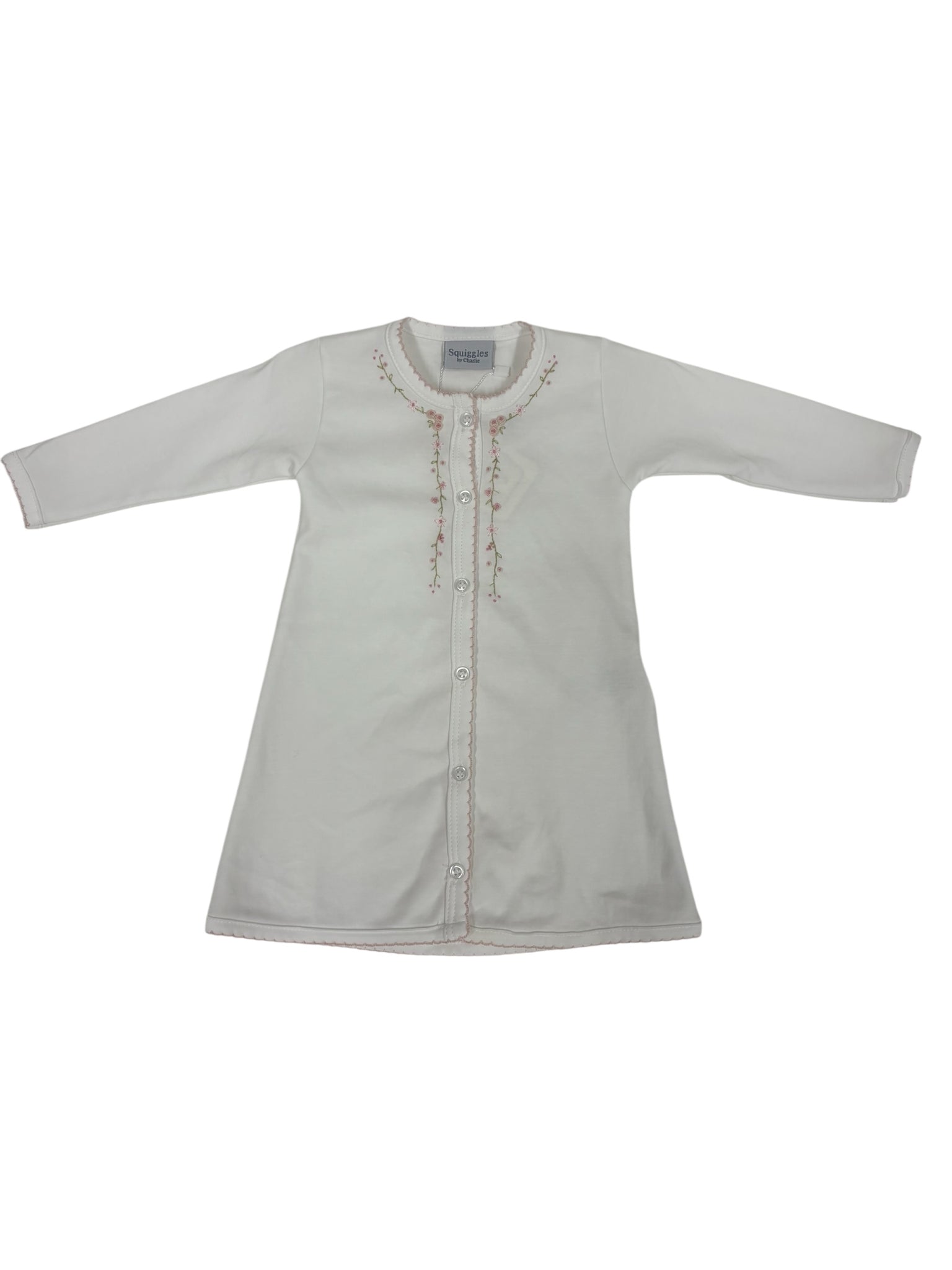 White pima cotton knit baby gown with embroidered flowers,. A sweet option for newborn girls take home gown and coming home outfit.