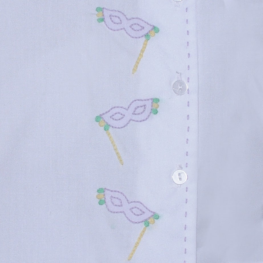 We love this sweet short-sleeve diaper set with Mardi Gras masks shadow embroidery down the front. Matching set also available for girls NB-24m.