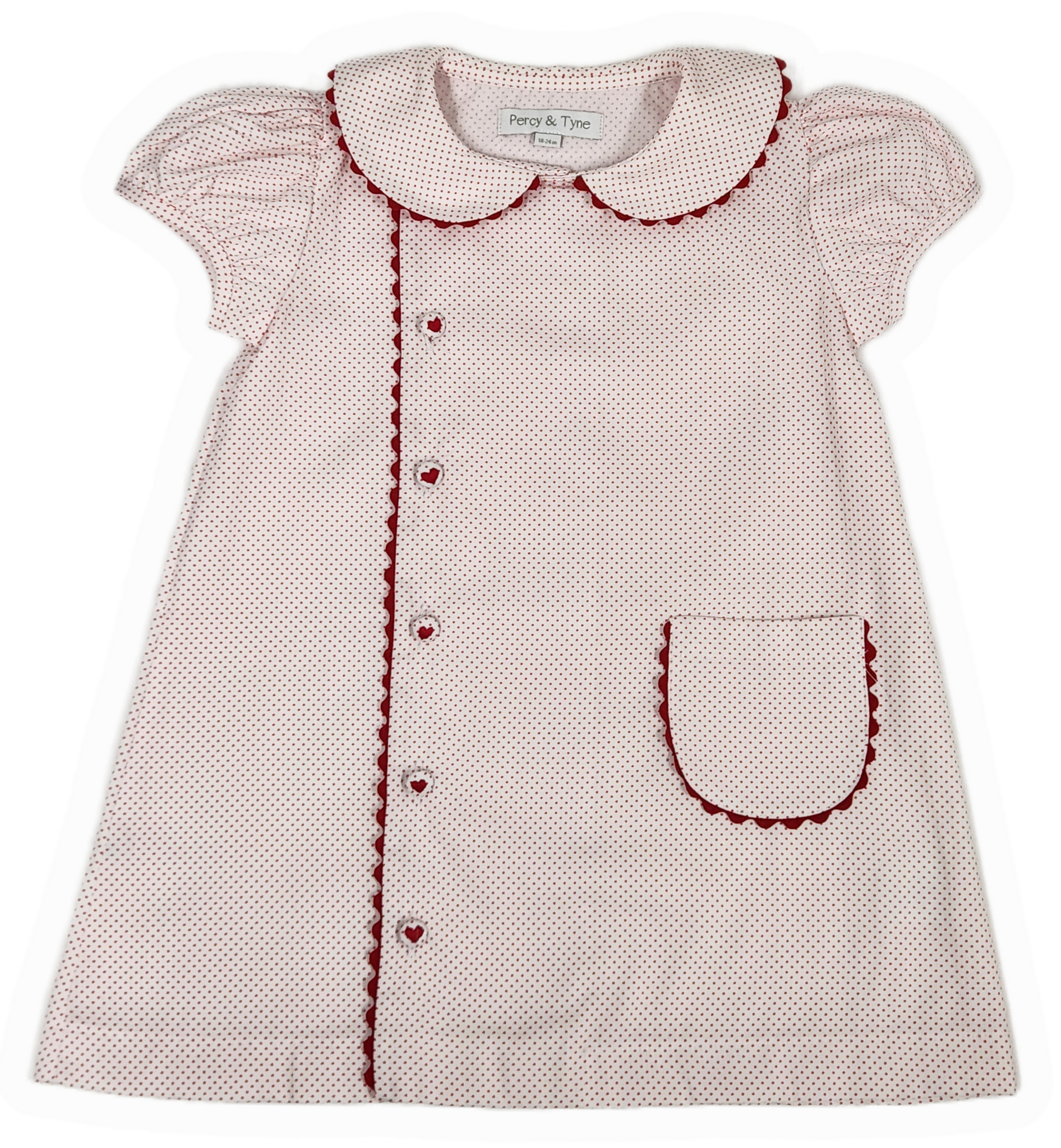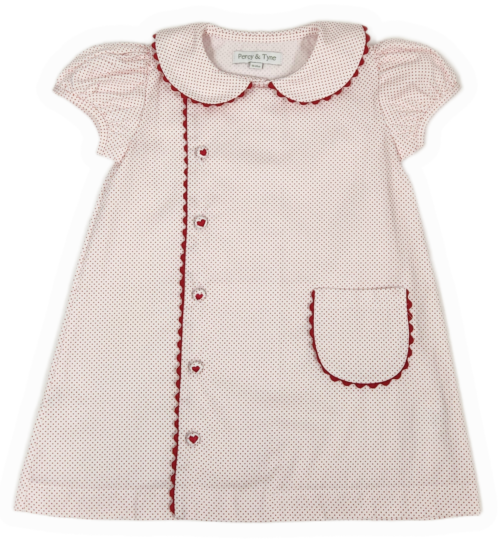 Precious red bitty dot print, red ricrac, peter pan collar, offset heart-embroidered buttons down the front, and a playful pocket, too! This dress has all the nostalgia of a classic silhouette, but it has been lovingly updated for today's little girl.