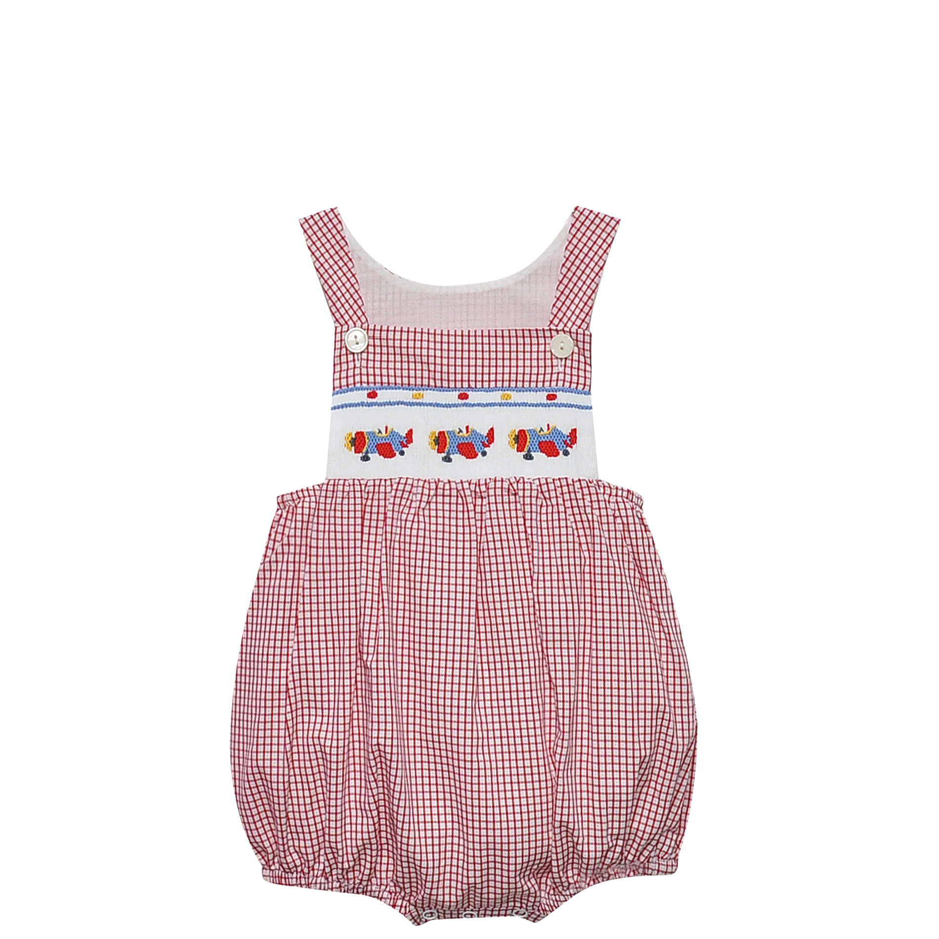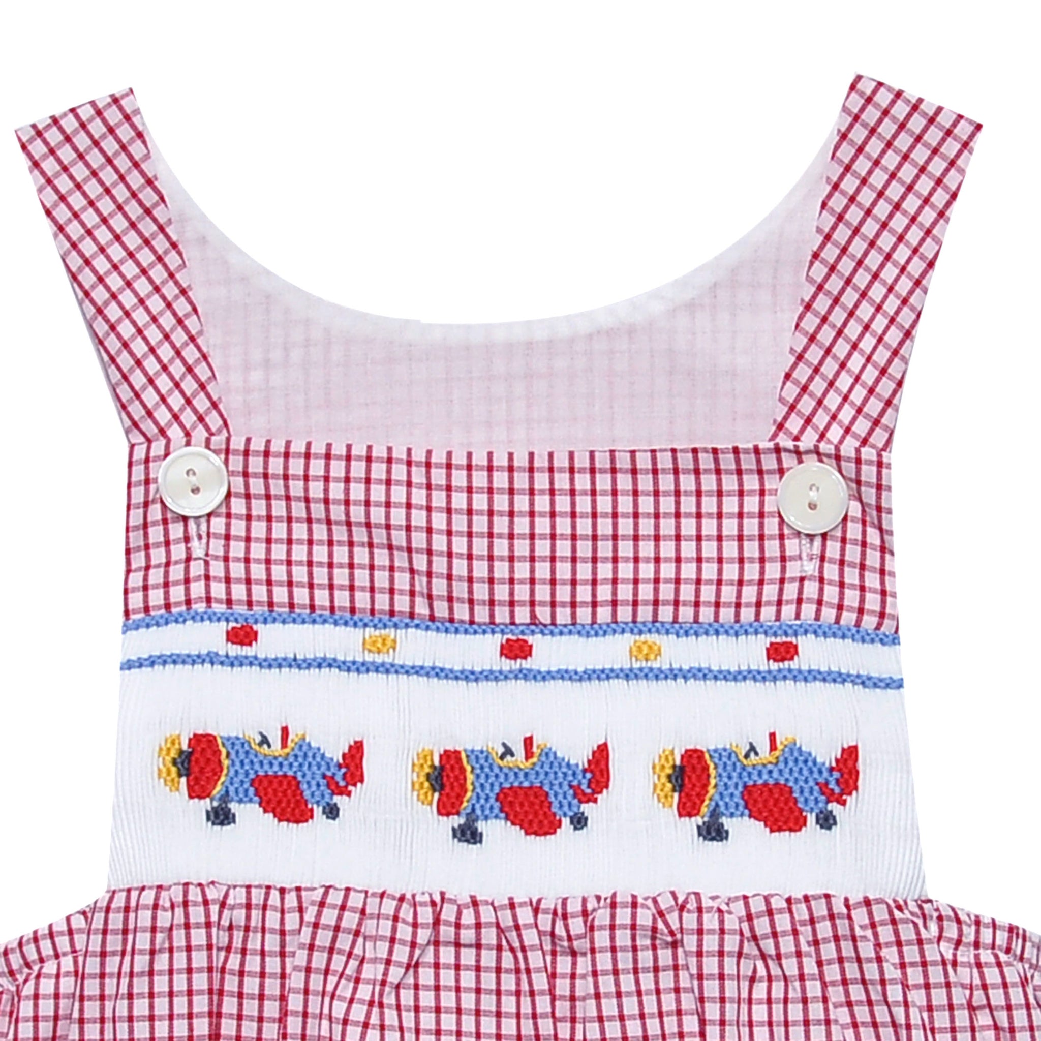 Precious summer bubble in red windowpane check with a trio of airplanes smocked across the chest