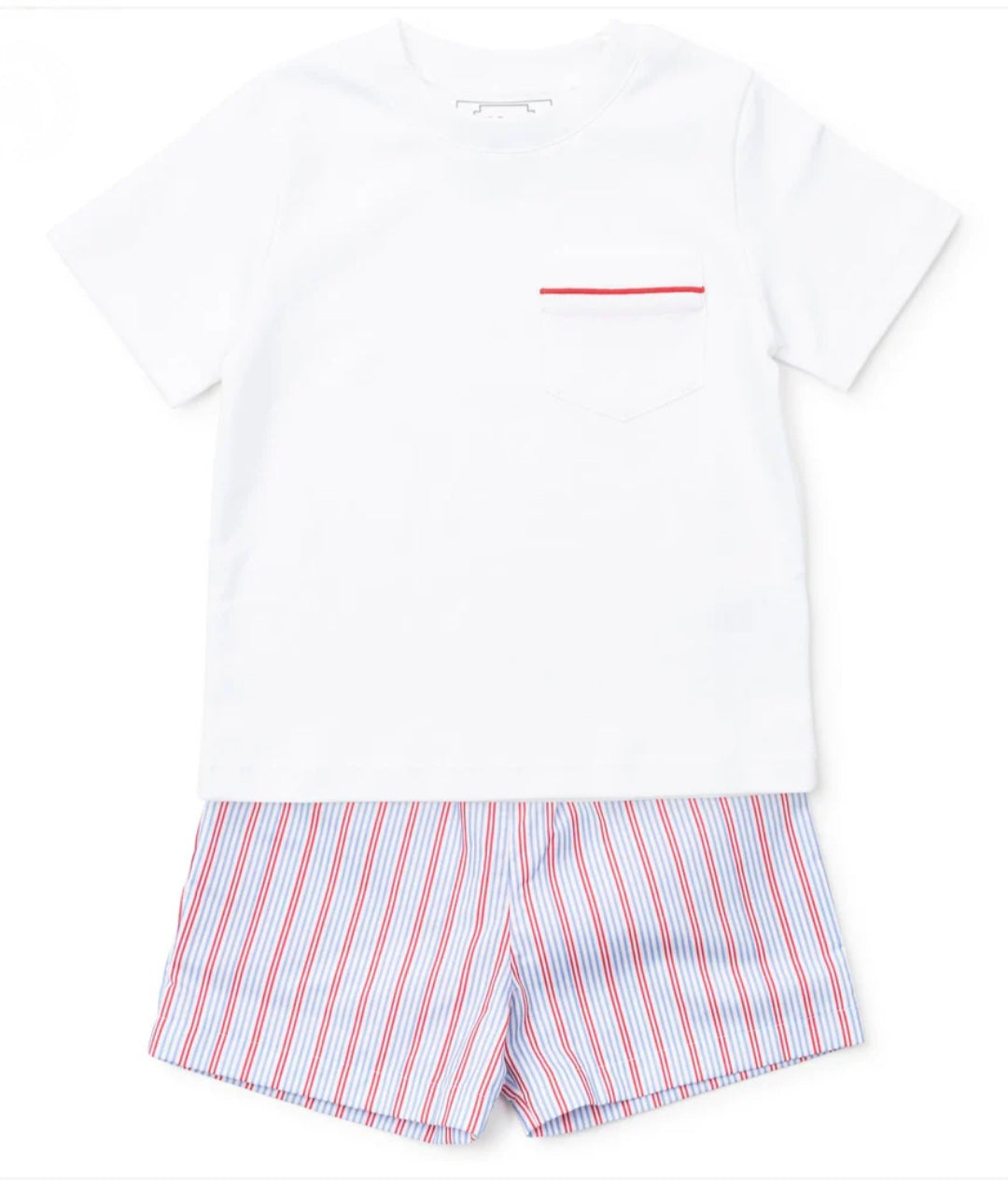 White T-Shirt has contrast piping on the pocket. Red and Blue Stripe Shorts are woven Pima Cotton.