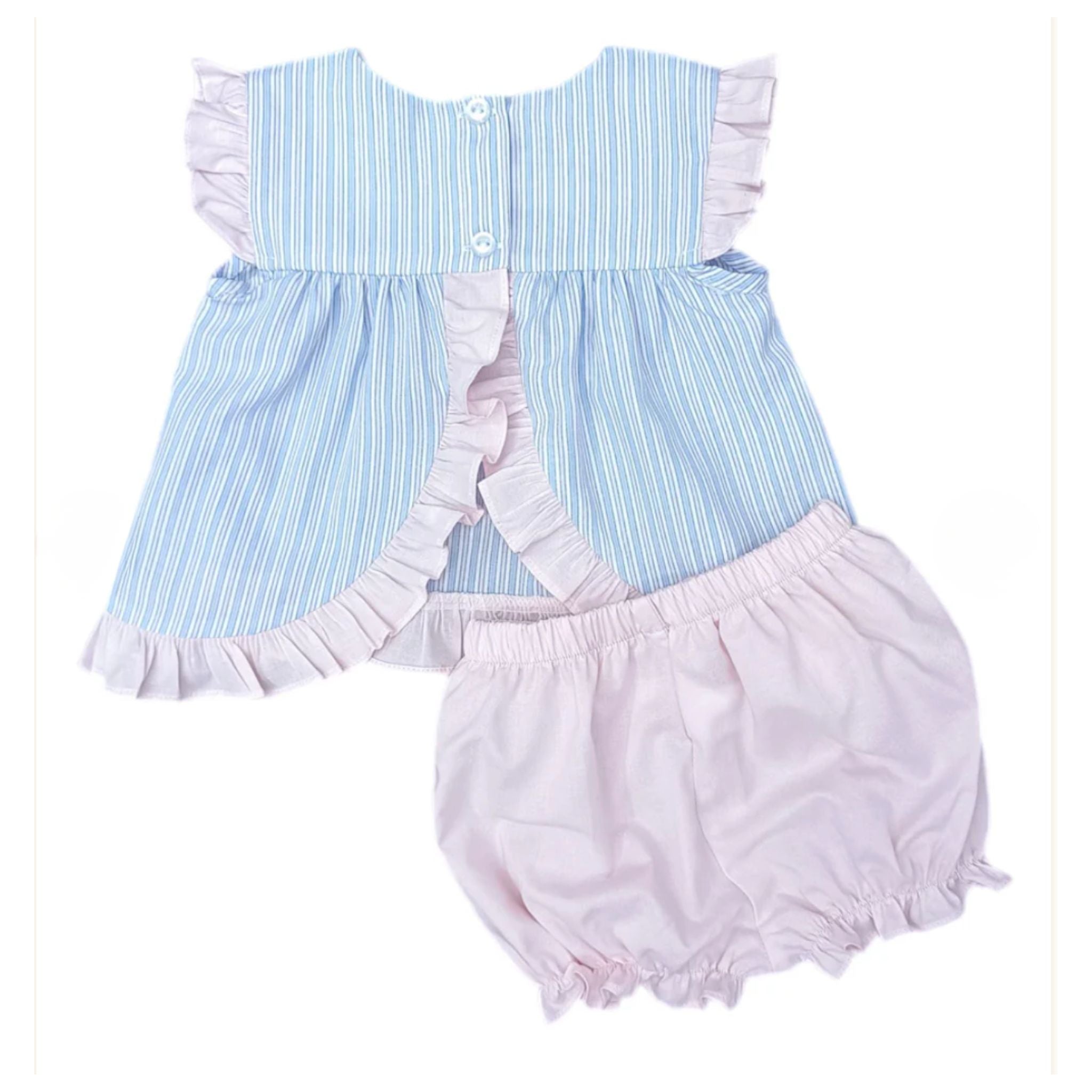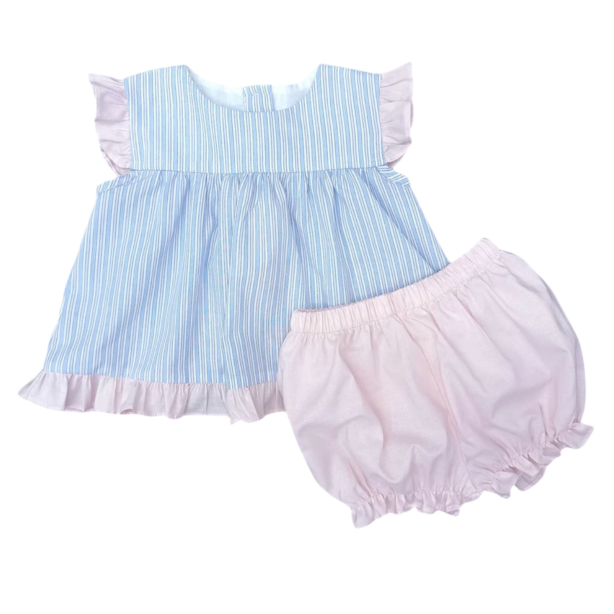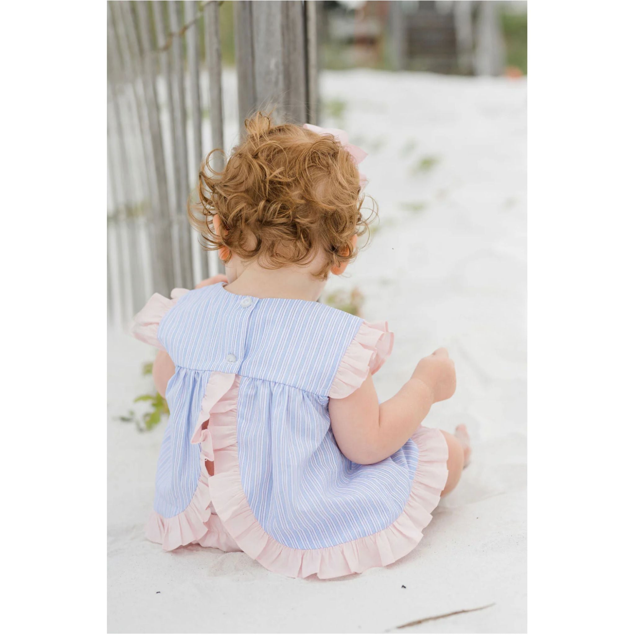 The Natalie Bloomer Set in Pink Stripe features a swing back top with a pink coordinating ruffle and pink bloomers.