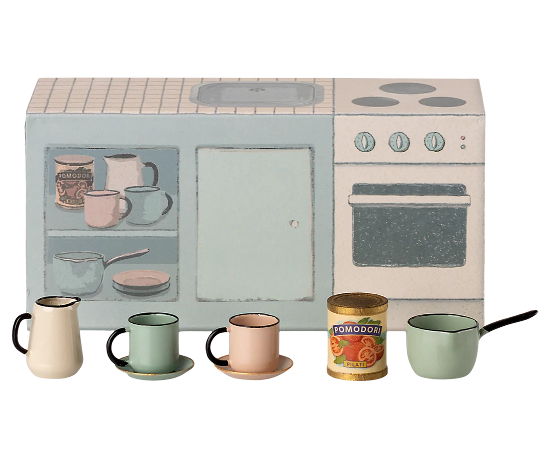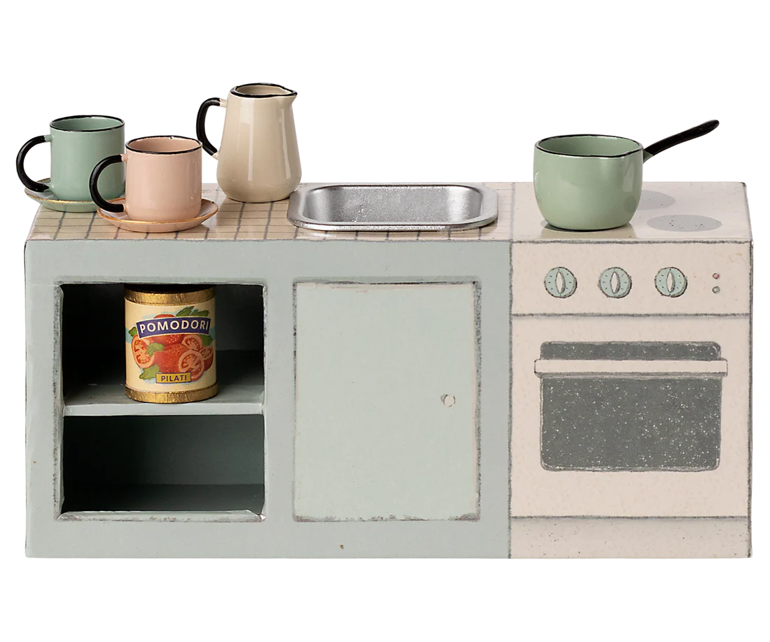 The small kitchen counter comes with 2 cups & 2 plates, a pot, a pitcher, and a small can. The small sink is made of metal to look as real as possible. This counter fits perfectly into the kitchen of the SuitCasa mouse house but of course can be used in other places as well!