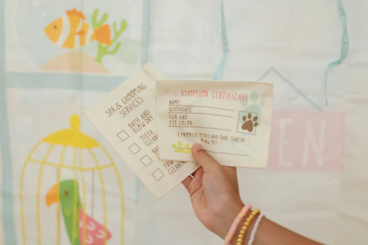 The Pet Shop & Groomer play shop is a space-saving playset crafted of washable poly-cotton canvas that hangs up from any doorway, inspiring hours of creative fun! Printed on both sides, the hand-drawn illustrations bring to life the cutest play shops, blending beautifully into your home and sparking endless play for your little shop owner.