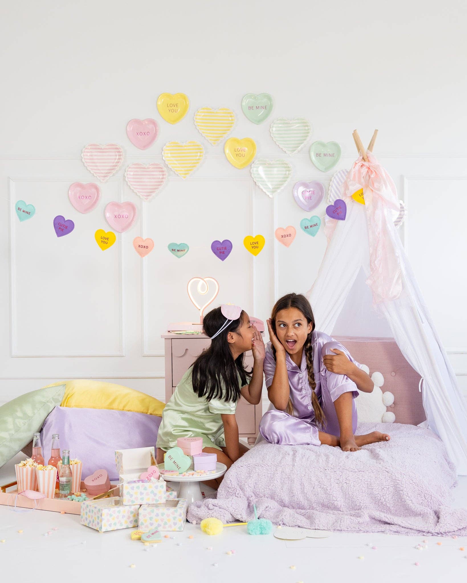 Add a dash of love to your next meal with our Striped Hearts Plate Set! These plates feature charming striped valentines hearts, making them perfect for any romantic occasion. Show your loved ones you care with this playful and festive plate set. Set the mood for a fun and memorable meal! • includes 8 paper plates • 10" x 9.25" • 2 each of 4 designs 3 sets of plates make 1 wholesale pack View the Conversation Hearts Collection HERE