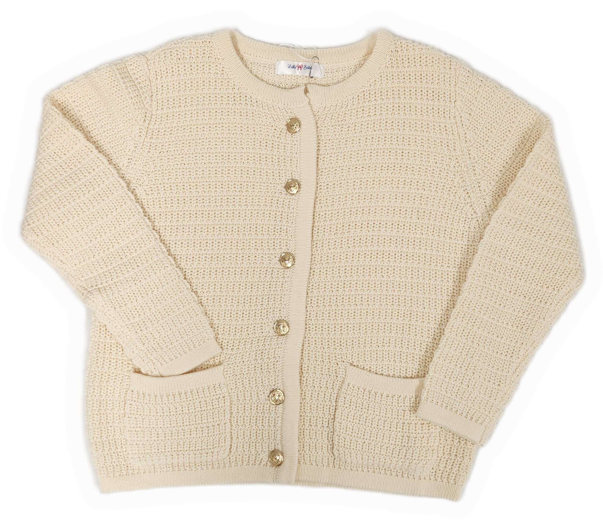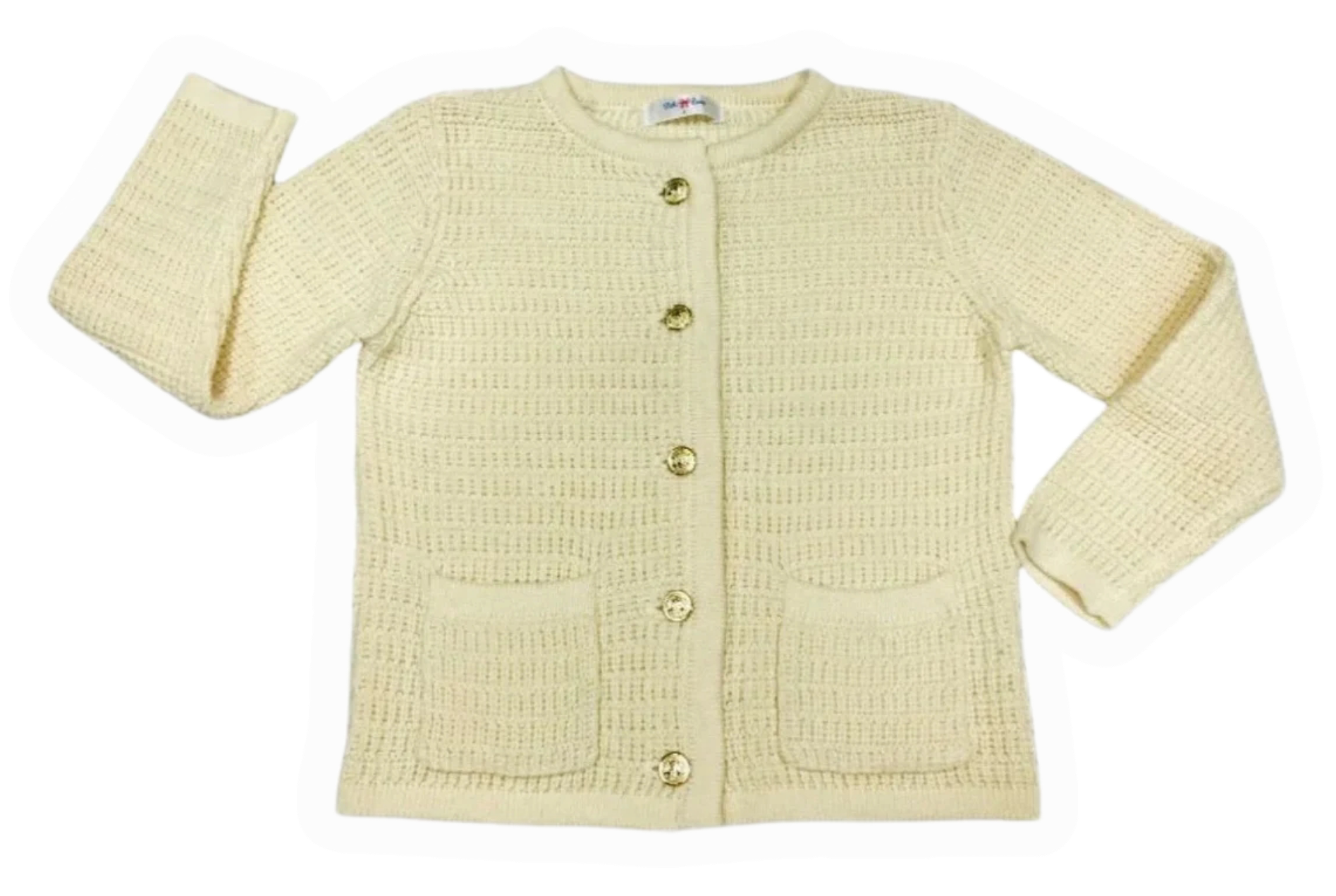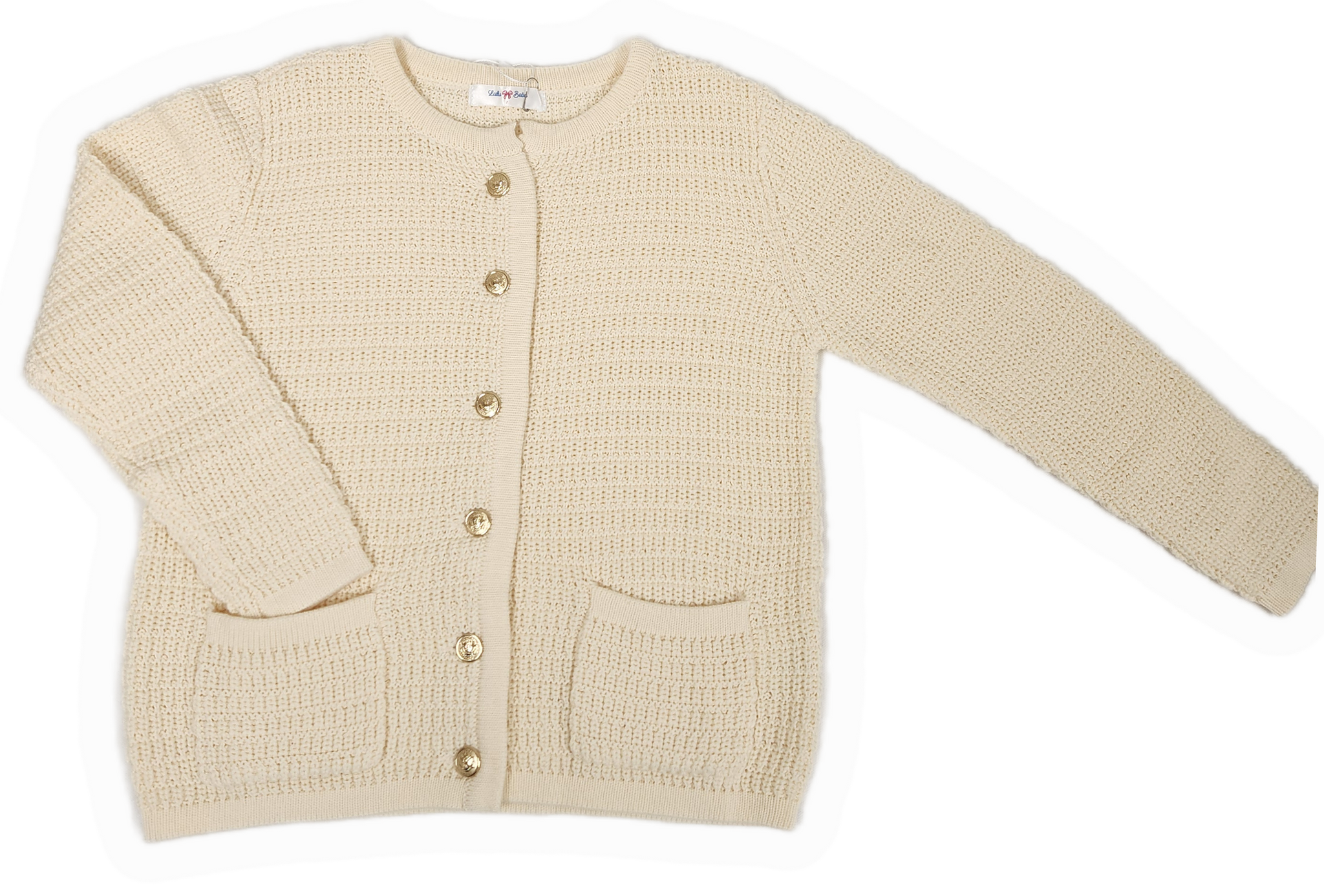 This cream cardigan with elegant gold buttons is perfect for girls sizes 6-10. Dress it up with a pretty dress for special occasions or pair it with jeans for a chic, casual look. Its versatile style adds a touch of warmth and sophistication to any outfit, making it a must-have wardrobe staple.